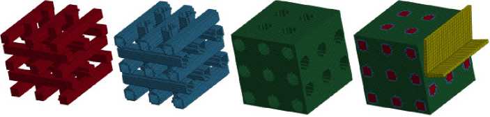 As is known, modeling of composite plastic deformation and fracture is a typical task when studying the impact of a sharp indenter, which penetrates an armor, vehicle crash tests, and simulation of machining of composite workpieces using edge tools. In all these cases, the best adequacy is provided by the use of micro models of composites. Therefore, a large number of publications reflect various methods of FRCM micro simulation. On this basis, such composite modeling programs as the TexGen program, created at the University of Nottingham, have been developed and even are distributed free of charge [6, 7]. However, this modeling has one significant drawback – it is necessary to use a large num- ber of partition sub-regions. If the fiber has a diameter of 10 μm, and the boundary layer has a thickness of 1 μm, then the size of the subregion cannot exceed 1 μm. Even for a part with dimensions of 1 mm, 109 subregions must be applied. In particular, one of the publications characterizes fragments of a composite using meshes with the number of finite element nodes from 105 to 1010. In this case, the construction of subregions of the matrix layers bordering the fibers is not carried out. Furthermore, no examples of filling a body of arbitrary complex shape, such as a turbine blade using this structure were detected. It is also clear, that such a large model for solving dynamic nonlinear problems cannot be used on most of modern computers.