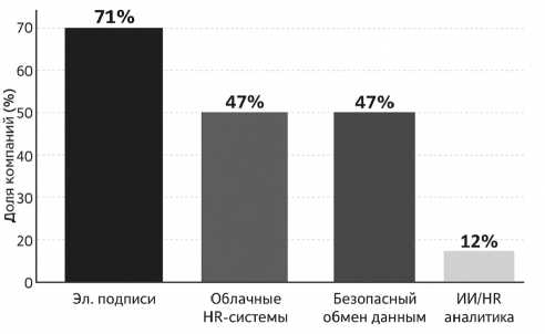 Оценка наиболее распространенных технологий (см. рис. 2) показывает, что цифровизация HR в ЦВЕ сохраняет административно-операционный характер: преобладают электронные подписи (71 %) и облачные HR-системы (47 %), тогда как использование ИИ-аналитики ограничивается 12 % организаций. Однако аналитика заработных плат и производительности на основе ИИ внедрена лишь в 12 % организаций. Это подтверждает, что цифровизация HR в ЦВЕ остается преимущественно операционно-административной, находясь на переходном этапе к стратегической интеграции ИИ-решений.
