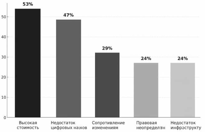 Барьеры и риски внедрения AI в HR-практиках. Исследование позволило выделить ряд системных препятствий (см. рис. 3), наиболее значимыми из которых остаются высокая стоимость технологий (53 %) и дефицит цифровых компетенций (47 %), за которыми следуют сопротивление изменениям (29 %) и правовая неопределенность (24 %). Эти факторы формируют организационную инерцию: компании осознают ценность цифровизации, но не могут реализовать ее системно. Дополнительным вызовом является цифровое неравенство – 53 % компаний отметили случаи цифрового исключения, особенно среди работников старшего возраста и низкоквалифицированного персонала.