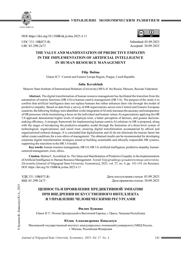 Цифровая трансформация управления человеческими ресурсами способствовала переходу от автоматизации рутинных функций (HR 4.0) к человеко-центричному управлению (HR 5.0). Цель исследования – подтвердить, что искусственный интеллект способен не заменить человека, а усилить его роль через модель предиктивной эмпатии. На основе данных опроса 698 организаций из 9 стран Центральной и Восточной Европы выявлено: а) интеграция ИИ-инструментов повышает точность и прозрачность процессов, сохраняя при этом фокус на человека и его ценности; б) организации, использующие подход HR 5.0, демонстрируют более высокий уровень доверия сотрудников, лучшее восприятие справедливости и повышение эффективности принятия решений. Предложены стратегическая рамка внедрения человеко-центричных AI-решений в HR и этапы внедрения предиктивно-эмпатической модели при формировании трехуровневой системы технологического, организационного и социального доверия, обеспечивающей цифровую трансформацию с этическими и организационно-культурными изменениями. Сделан вывод, что цифровизация и ИИ не устраняют человеческий фактор, а формируют условия для новой этики управления. Полученные результаты могут быть рекомендованы при разработке корпоративных стратегий цифровой трансформации и направлены на формирование устойчивых и этически ответственных HR-систем, обеспечивающих переход к модели HR 5.0.