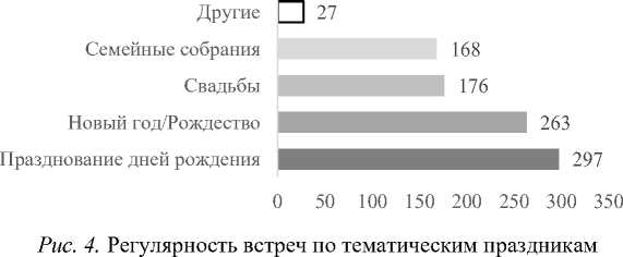 Чаще всего опрошенные встречаются для совместного празднования дней рождения, Нового года и Рождества (рисунок 4), что подчеркивает социально-культурную направленность внутрисемейного диалога. На рисунке 5 отмечена частота семейных встреч. 38,5% опрошенных говорят о ежеквартальной регулярности встреч, при этом набольшее сожаление о невозможности встречаться чаще выражают представители серебряного возраста.