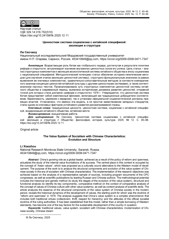 Возрастающая роль Китая как глобального лидера, достигнутая в результате политики реформ и открытости, актуализирует изучение внутренних ценностных основ его успеха. Цель статьи – анализ структурных компонентов и эволюции аксиологической системы китайского общества в эпоху социализма с национальной спецификой. Методологический потенциал статьи обеспечен историко-генетическим методом (для изучения этапов эволюции ценностной системы), структурно-функциональным анализом (в рамках выявления ее ключевых компонентов), сравнительно-сопоставительным методом (в контексте компаративного анализа концепции ценностей китайской культуры с другими ценностными системами), а также контент-анализом научных текстов. Проанализирована суть структурных компонентов ценностной системы китайского общества в современный период, выявлена историческая динамика развития ценностей, отправной точкой для которых стала доктрина «реформ и открытости» 1978 г. Утверждается, что ценностная система Китая представляет собой комплексный феномен, включающий как традиционные добродетели (коллективизм, бережливость, уважение к иерархии), так и установки официальной социалистической доктрины правящих властей. Установлено, что именно эта модель, а не простое заимствование западных стандартов, стала одним из ключевых факторов устойчивого развития рассматриваемой страны.