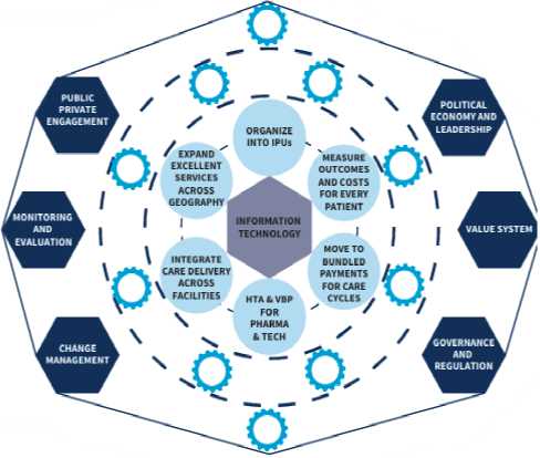 Рис. 1 демонстрирует, что система VBC строится как многослойная сеть взаимосвязанных компонентов. В ее центре информационные технологии и единая база данных об исходах и затратах, позволяющая организовать оказание помощи по принципу интегрированных практических подразделений интегрированных практических блоков, объединяющих специалистов разных профилей вокруг пациента [11]. Далее формируется связка управленческих контуров: оценка исходов и стоимости для каждого пациента, переход к оплате за циклы ухода (bundled payments), применение ценностно-ориентированной модели и пациенто-ориентированной модели для лекарств и технологий. Внешнее кольцо включает условия, обеспечивающие устойчивость: политическая поддержка и лидерство, регулирование, государственно-частное партнерство, мониторинг и оценка, управление изменениями.