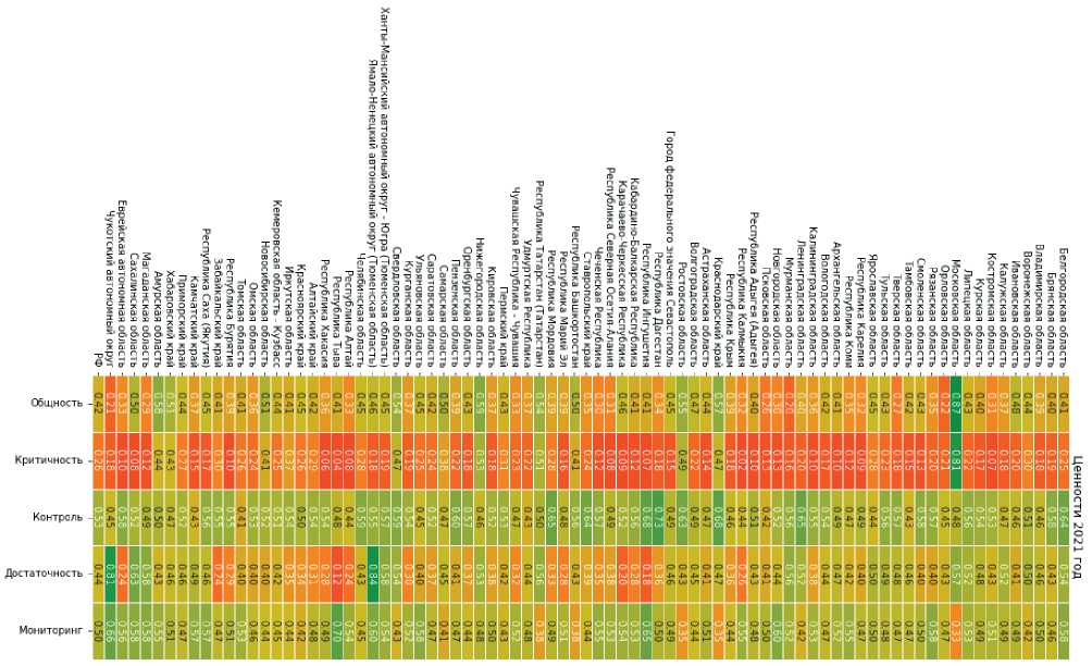 В 2021 году структура распределения интегральных ценностей в регионах России демонстрирует признаки выравнивания показателей и постепенного снижения межрегиональной дифференциации. На рис. 3 представлено сопоставление пяти ключевых компонентов ЦОЗ общности, критичности, контроля, достаточности и мониторинга для всех субъектов Российской Федерации.
