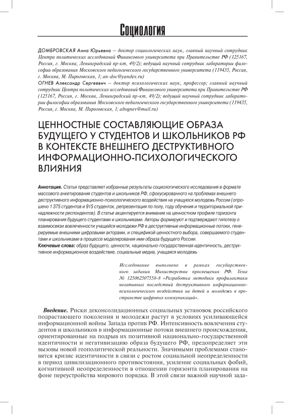 Ценностные составляющие образа будущего у студентов и школьников РФ в контексте внешнего деструктивного информационно-психологического влияния