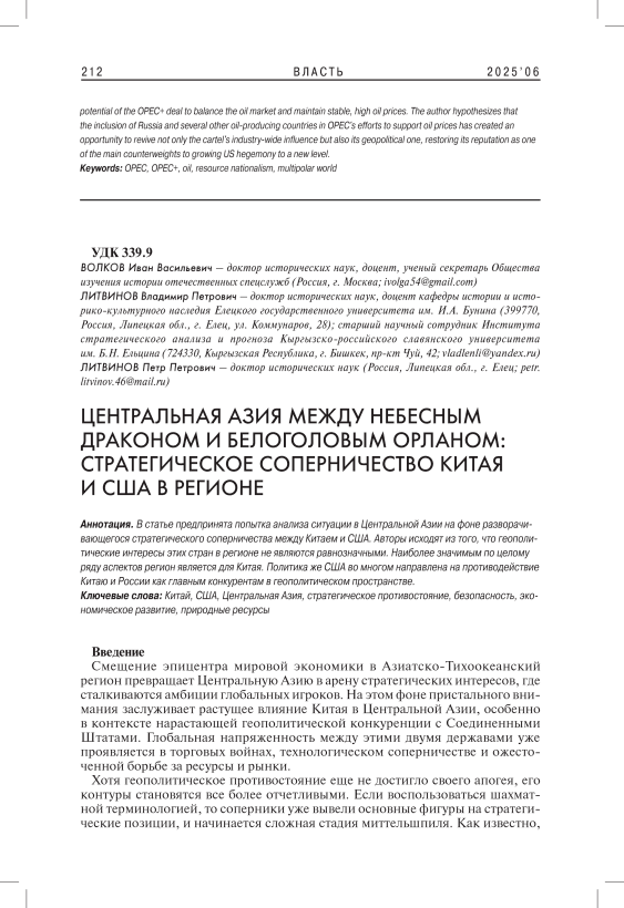 В статье предпринята попытка анализа ситуации в Центральной Азии на фоне разворачивающегося стратегического соперничества между Китаем и США. Авторы исходят из того, что геополитические интересы этих стран в регионе не являются равнозначными. Наиболее значимым по целому ряду аспектов регион является для Китая. Политика же США во многом направлена на противодействие Китаю и России как главным конкурентам в геополитическом пространстве.