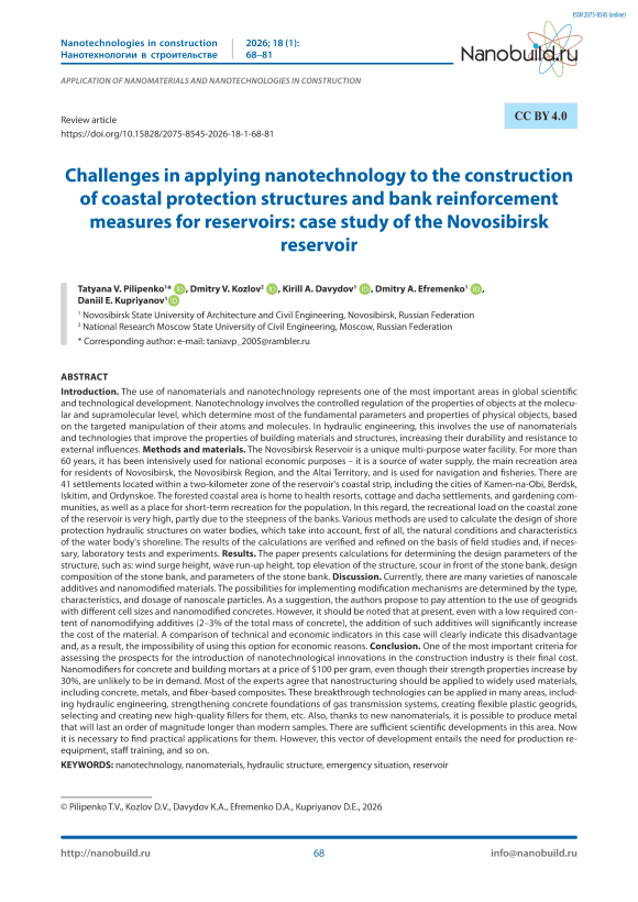Introduction. The use of nanomaterials and nanotechnology represents one of the most important areas in global scientific and technological development. Nanotechnology involves the controlled regulation of the properties of objects at the molecular and supramolecular level, which determine most of the fundamental parameters and properties of physical objects, based on the targeted manipulation of their atoms and molecules. In hydraulic engineering, this involves the use of nanomaterials and technologies that improve the properties of building materials and structures, increasing their durability and resistance to external influences. Methods and materials. The Novosibirsk Reservoir is a unique multi-purpose water facility. For more than 60 years, it has been intensively used for national economic purposes – it is a source of water supply, the main recreation area for residents of Novosibirsk, the Novosibirsk Region, and the Altai Territory, and is used for navigation and fisheries. There are 41 settlements located within a two-kilometer zone of the reservoir's coastal strip, including the cities of Kamen-na-Obi, Berdsk, Iskitim, and Ordynskoe. The forested coastal area is home to health resorts, cottage and dacha settlements, and gardening communities, as well as a place for short-term recreation for the population. In this regard, the recreational load on the coastal zone of the reservoir is very high, partly due to the steepness of the banks. Various methods are used to calculate the design of shore protection hydraulic structures on water bodies, which take into account, first of all, the natural conditions and characteristics of the water body's shoreline. The results of the calculations are verified and refined on the basis of field studies and, if necessary, laboratory tests and experiments. Results. The paper presents calculations for determining the design parameters of the structure, such as: wind surge height, wave run-up height, top elevation of the structure, scour in front of the stone bank, design composition of the stone bank, and parameters of the stone bank. Discussion. Currently, there are many varieties of nanoscale additives and nanomodified materials. The possibilities for implementing modification mechanisms are determined by the type, characteristics, and dosage of nanoscale particles. As a suggestion, the authors propose to pay attention to the use of geogrids with different cell sizes and nanomodified concretes. However, it should be noted that at present, even with a low required content of nanomodifying additives (2–3% of the total mass of concrete), the addition of such additives will significantly increase the cost of the material. A comparison of technical and economic indicators in this case will clearly indicate this disadvantage and, as a result, the impossibility of using this option for economic reasons. Conclusion. One of the most important criteria for assessing the prospects for the introduction of nanotechnological innovations in the construction industry is their final cost. Nanomodifiers for concrete and building mortars at a price of $100 per gram, even though their strength properties increase by 30%, are unlikely to be in demand. Most of the experts agree that nanostructuring should be applied to widely used materials, including concrete, metals, and fiber-based composites. These breakthrough technologies can be applied in many areas, including hydraulic engineering, strengthening concrete foundations of gas transmission systems, creating flexible plastic geogrids, selecting and creating new high-quality fillers for them, etc. Also, thanks to new nanomaterials, it is possible to produce metal that will last an order of magnitude longer than modern samples. There are sufficient scientific developments in this area. Now it is necessary to find practical applications for them. However, this vector of development entails the need for production reequipment, staff training, and so on.