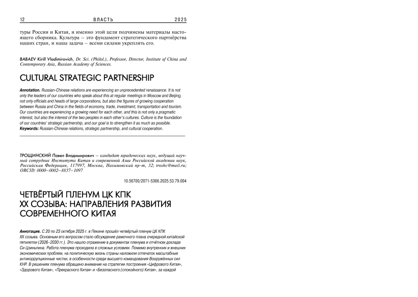 С 20 по 23 октября 2025 г. в Пекине прошел четвертый Пленум ЦК КПК ХХ созыва. Основным его вопросом стало обсуждение рамочного плана очередной китайской пятилетки (2026-2030 гг.). Это нашло отражение в документах Пленума и отчетном докладе Си Цзиньпина. Работа Пленума проходила в сложных условиях. Помимо внутренних и внешних экономических проблем, на политическую жизнь страны наложили отпечаток масштабные антикоррупционные чистки, в особенности среди высшего командования Вооруженных сил КНР. В решениях Пленума обращено внимание на стратегии построения «Цифрового Китая», «Здорового Китая», «Прекрасного Китая» и «Безопасного (спокойного) Китая», за каждой из которых стоит определенная система идей и практических действий. Китай ожидают трудности в будущем, но им продолжается поиск наиболее эффективных инновационных путей их разрешения.