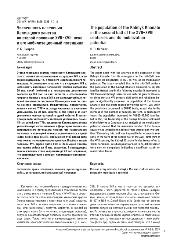 Статья посвящена анализу численности Калмыцкого ханства от начала его возникновения в середине XVII в. и до его ликвидации в 1771 г., а также его мобилизационного потенциала. Исследование показало, что в середине XVII в. численность населения Калмыцкого ханства составляла 50 тыс. семей (кибиток) и в последующие десятилетия возросла до 100 тыс. за счет захватов и естественного прироста. Однако с конца XVII в. из-за междоусобиц и мятежей численность населения Калмыцкого ханства стала заметно сокращаться. Междоусобицы прекратились только к началу 1740-х гг., когда численность населения уменьшилась до 30 тыс. кибиток, в том числе и за счет увеличения количества семей в одной кибитке. В последующие годы численность населения увеличилась до 40– 45 тыс. семей, но в 1771 г. руководство Калмыцкого ханства увело большую часть калмыков в Джунгарию. Анализ мобилизационного потенциала показал, что максимальная численность калмыцкой конницы ограничивалась нормой «один воин с двух семей». Превышение этой нормы было невозможно по экономическим причинам. В войнах второй половины XVII–первой трети XVIII в. Калмыцкое ханство выставляло войска до 10 тыс. всадников. В последующих войнах в походы стали направлять до 20 тыс. всадников, что свидетельствует о большом мобилизационном напряжении сил.