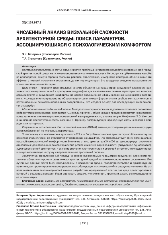 Постановка проблемы. В статье анализируется проблема негативного воздействия современной городской архитектурной среды на психоэмоциональное состояние человека. Несмотря на субъективные жалобы на однообразие, скуку и стресс в спальных районах, объективные, измеримые критерии, объясняющие эти эффекты с позиций психологии восприятия, до сих пор отсутствуют. Это затрудняет создание психологически комфортной визуальной среды. Цель статьи – провести сравнительный анализ объективных параметров визуальной сложности различных архитектурных стилей и природных ландшафтов для выявления численных характеристик, которые ассоциируются с визуальным комфортом на основе эволюционно сформированных механизмов восприятия. Исследование направлено на объективацию связи между формальными свойствами архитектуры и потенциальным психоэмоциональным воздействием, что создает основу для последующих экспериментальных работ. Методология и методы исследования. Методологическую основу исследования составляют положения нейроэстетики и психологии восприятия (С. Зеки, К. Фристон), объясняющие процесс восприятия как активное предсказание и минимизацию информационной неопределенности, а также теория биофилии (Э.О. Уилсон) и концепция предпочтения среды саванны (Г. Орианс), постулирующие врожденную связь человека с природными паттернами. Результаты исследования. Статистический анализ (ANOVA) выявил достоверные различия между группами изображений по ключевым параметрам. Установлено, что классическая архитектура XIX в. и биоурбанистическая архитектура по большинству параметров статистически не отличаются от природных ландшафтов, что свидетельствует об их потенциально высокой психологической комфортности. В отличие от них, архитектура XX и XXI вв. демонстрирует значимые отклонения: для панельных домов характерно резкое снижение вариабельности (визуальное однообразие), а для современной архитектуры – высокие значения плотности углов и цветовой энтропии, что создает повышенную когнитивную нагрузку и перенапряжение зрительной системы. Заключение. Предложенный подход на основе вычисляемых параметров визуальной сложности позволяет объективизировать связь между архитектурной средой и психоэмоциональным состоянием. Полученные данные могут быть использованы в психологии среды, градостроительстве и архитектурной практике для проектирования пространств, способствующих психическому благополучию человека. На основе выявленных закономерностей можно разработать программный плагин для сред проектирования, который в реальном времени будет оценивать визуальную сложность проекта и давать рекомендации по ее оптимизации.