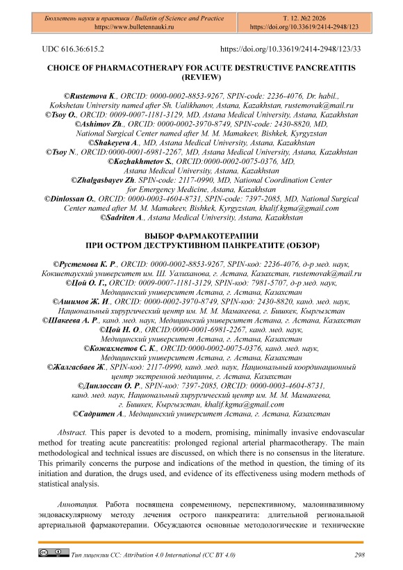 That is, we once again emphasize the lack of randomized controlled studies evaluating the clinical and prognostic effectiveness of prolonged regional intra-arterial drug therapy in the complex surgical treatment of patients with acute pancreatitis, as well as data obtained from a meta-analysis of several randomized controlled clinical trials. The majority of scientific works on this issue are based on small randomised controlled trials involving a limited number of patients or on nonrandomised clinical trials. Most likely, this explains the absence of regional intra-arterial infusion therapy in the clinical guidelines of the Russian Federation and the Republic of Kazakhstan.