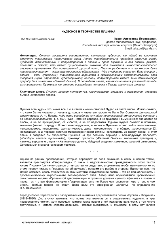 Статья посвящена рассмотрению категории чудесного как одной из ключевых структур пушкинского поэтического мира. Автор последовательно проводит различие между чудесным, таинственным и потусторонним в поэзии и прозе Пушкина, в его поэмах, романе, повестях и сказках, что имеет существенное значение для понимания ценностно-смыслового строения пушкинианы. Как православный русский поэт, Пушкин разделяет – и во многом даже противопоставляет – указанные смысловые образования. Чудо и чудесное у него от Бога («мороз и солнце – день чудесный!»), таинственное коренится в промежуточном экзистенциальном слое творения («ужо, строитель чудотворный!»); наконец, потустороннее имеет явно демоническую природу (вся сюжетика «Пиковой дамы»). В последнем счете, взаимоотношения указанной триады выстраиваются Пушкиным как ступени восхождения человека к Творцу или отказа от него.