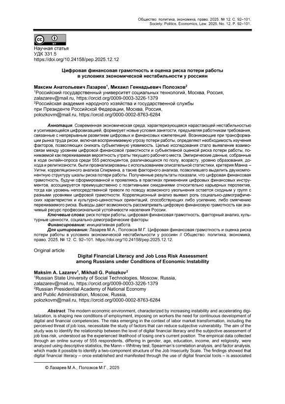 Современная экономическая среда, характеризующаяся нарастающей нестабильностью и усиливающейся цифровизацией, формирует новые условия занятости, предъявляя работникам требования, связанные с непрерывным развитием цифровых и финансовых компетенций. Возникающие при трансформации рынка труда риски, включая воспринимаемую угрозу потери работы, определяют необходимость изучения факторов, позволяющих снижать субъективную уязвимость. Целью исследования стало выявление взаимосвязи между уровнем цифровой финансовой грамотности и субъективной оценкой риска потери работы, понимаемой как переживаемая вероятность утраты текущего рабочего места. Эмпирические данные, собранные в ходе онлайн-опроса среди 555 респондентов, различающихся по полу, возрасту, уровню образования, дохода и религиозности, были проанализированы с использованием описательной статистики, критерия Манна – Уитни, корреляционного анализа Спирмена, а также факторного анализа, позволившего выделить двухкомпонентную структуру шкалы риска потери работы. Полученные результаты показали, что цифровая финансовая грамотность, будучи сформированной и проявляясь в практиках применения цифровых финансовых инструментов, ассоциируется преимущественно с позитивными ожиданиями относительно карьерных перспектив, тогда как уровень непосредственной тревоги по поводу возможного увольнения остается сходным у групп с разными уровнями цифровой грамотности. Корреляционный анализ выявил роль социально-демографических характеристик и культурно-ценностных ориентаций, способствующих либо усилению, либо смягчению переживаемого риска. Выводы дают возможность рассматривать цифровую финансовую грамотность как значимый ресурс профессиональной устойчивости населения России.