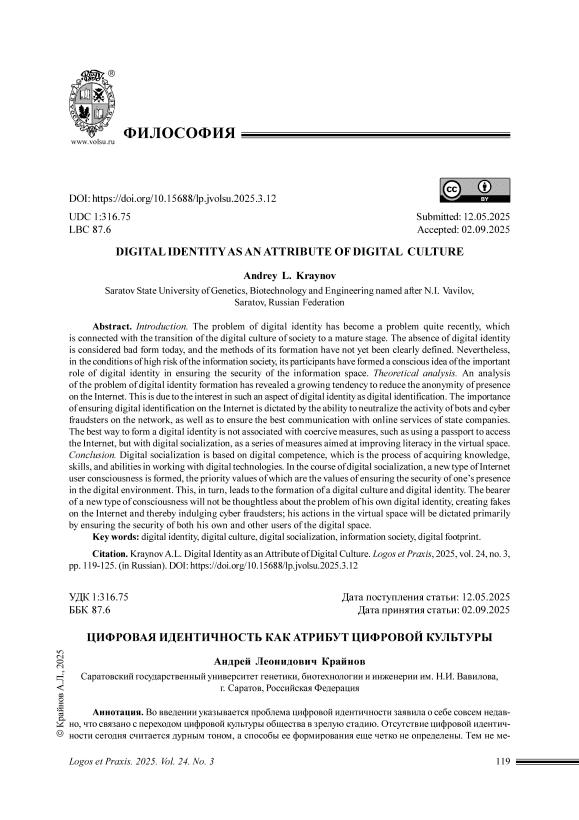 Во введении указывается проблема цифровой идентичности заявила о себе совсем недавно, что связано с переходом цифровой культуры общества в зрелую стадию. Отсутствие цифровой идентичности сегодня считается дурным тоном, а способы ее формирования еще четко не определены. Тем не менее в условиях большой рискогенности информационного общества у его участников сформировалось осознанное представление о важной роли цифровой идентичности в обеспечении безопасности информационного пространства. В теоретической части представлен анализ проблемы формирования цифровой идентичности, который выявил растущую тенденцию к снижению анонимности присутствия в сети Интернет. Это связано с проявлением интереса к такому аспекту цифровой идентичности как цифровая идентификация. Важность обеспечения цифровой идентификации в сети Интернет продиктована возможностью нивелировать активность ботов и кибермошенников в сети, а также обеспечить наилучшую коммуникацию с онлайн-сервисами государственных компаний. Лучший способ формирования цифровой идентичности связан не с принудительными мерами, например, требованием использования паспорта для выхода в Интернет, а с цифровой социализацией как серией мер, направленных на повышение грамотности работы в виртуальном пространстве. В заключении делается вывод, что в основе цифровой социализации лежит цифровая компетентность, представляющая собой процесс получения знаний, умений и навыков работы с цифровыми технологиями. В ходе цифровой социализации формируется новый тип сознания пользователя Интернета, приоритетными ценностями которого выступают ценности обеспечения безопасности своего присутствия в цифровой среде. Это, в свою очередь, приводит к формированию цифровой культуры и цифровой идентичности. Носитель нового типа сознания не будет бездумно относиться к проблеме собственной цифровой идентичности, создавая фейки в сети Интернет и тем самым потворствуя кибермошенникам, его действия в виртуальном пространстве будут продиктованы, прежде всего, обеспечением безопасности как своей, так и других пользователей цифрового пространства.