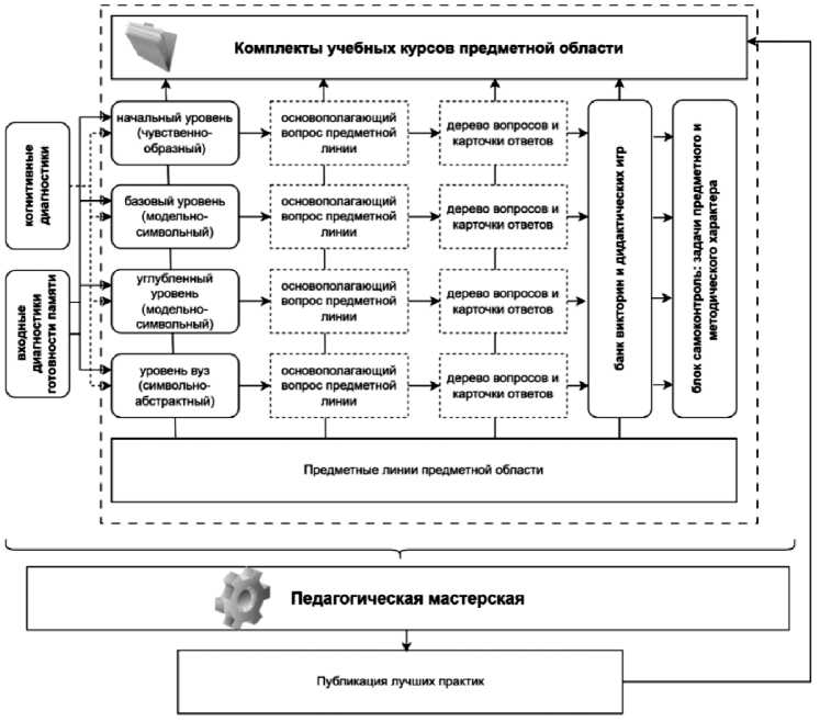 Эти требования определяют компоненты цифровой платформы формирования готовности учить: комплект учебных курсов по дисциплинам, комплексы когнитивных диагностик и оценочных процедур, игровые вопросно-задач-ные викторины, а также педагогическую мастерскую, в которой предусматривается разработка учебных средств и методов обучения. Структурно-содержательная модель образовательной платформы представлена на рис. 1.