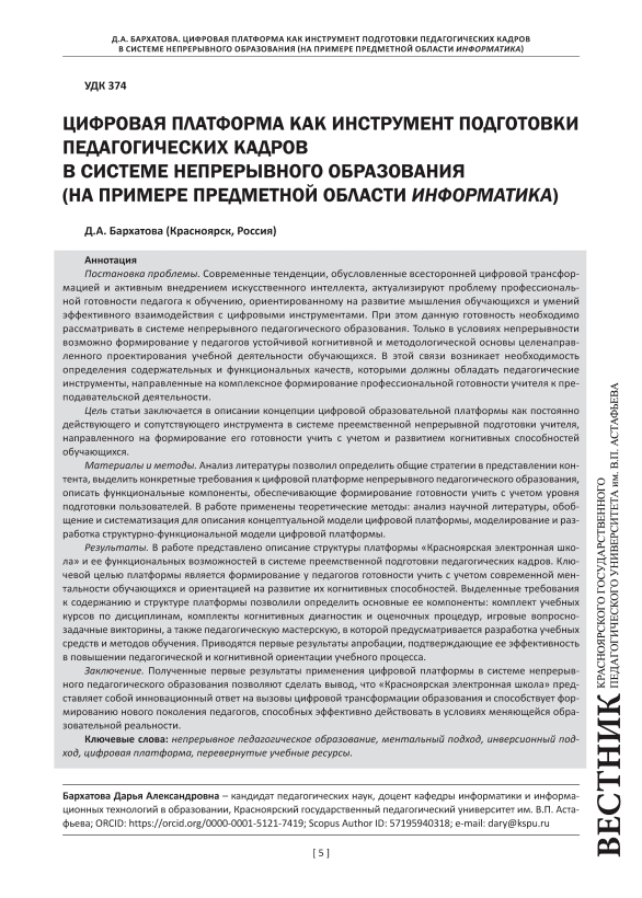 Бархатова Дарья Александровна - кандидат педагогических наук, доцент кафедры информатики и информационных технологий в образовании, Красноярский государственный педагогический университет им. В.П. Астафьева; ORCID: ; Scopus Author ID: 57195940318; e-mail: