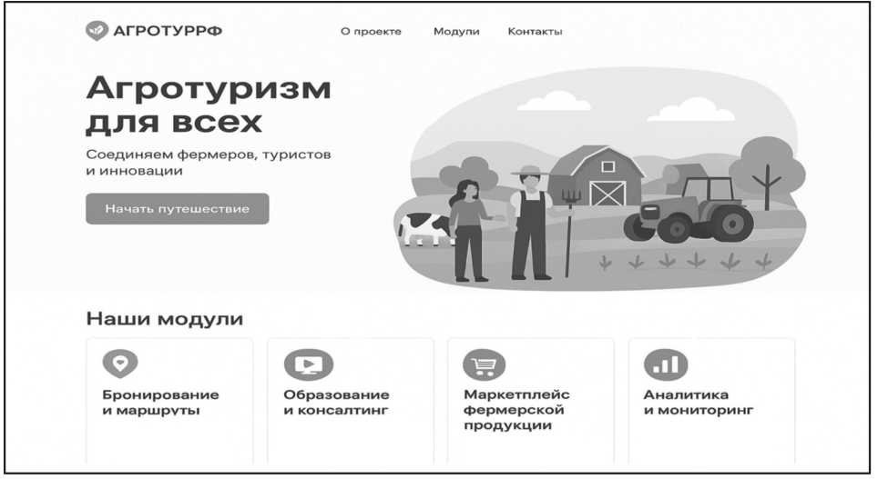 В качестве ответа на эти вызовы предлагается создание цифровой платформы «АгроТурРФ», которая будет служить единой экосистемой для туристов, фермеров и регуляторов. Архитектура платформы предполагает интеграцию нескольких модулей: интерактивного каталога агротуристических объектов на базе геоинформационных систем (ГИС) с возможностью поиска по типу активности (например, винодельни, сыроварни, экологические тропы); системы онлайн-бро-нирования с календарем доступности и динамическим ценообразованием; образовательного блока с видеоуроками и шаблонами бизнес-планов для фермеров; маркетплейса локальной продукции, который позволит реализовывать фермерские товары напрямую потребителям, расширяя доходы аграриев (см. Рисунок).