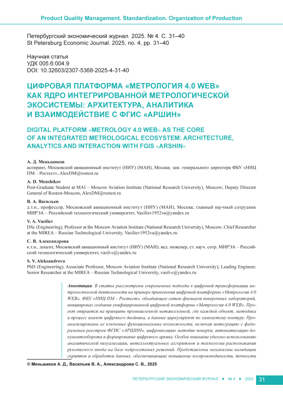 В статье рассмотрены современные подходы к цифровой трансформации метрологической деятельности на примере применения цифровой платформы «Метрология 4.0 WEB». ФБУ «НИЦ ПМ – Ростест», обладающее сетью филиалов поверочных лабораторий, инициировал создание унифицированной цифровой платформы «Метрология 4.0 WEB». Проект опирается на принципы промышленной метавселенной, где каждый объект, методика и процесс имеют цифрового двойника, а данные циркулируют по замкнутому контуру. Проанализированы ее ключевые функциональные возможности, включая интеграцию с федеральным реестром ФГИС «АРШИН», цифровизацию методик поверки, автоматизацию документооборота и формирование цифрового архива. Особое внимание уделено использованию аналитической визуализации, интеллектуальных алгоритмов и технологии распознавания рукописного ввода на базе нейросетевых решений. Представлены механизмы валидации скриптов и обработки данных, обеспечивающие повышение воспроизводимости, точности и прозрачности метрологического контроля. Все валидированные скрипты соответствуют требованиям методик поверки и калибровки, а также требованиям к пакетам программ по ГОСТ Р ИСО/МЭК 12119–2000 и алгоритмам и программам обработки данных, которые выделены как самостоятельные объекты, существуют обособленно по МИ 2174–91 и допущены к применению. Рассмотрены средства мониторинга загрузки сотрудников, формирования отчетности и обработки заявок в режиме реального времени с применением интерактивных дашбордов и цифровых шаблонов документов. Описаны возможности интеграции платформы с внутренними информационными системами предприятий, а также инструменты поддержки командной работы и самообучения персонала. Отмечена роль платформы в снижении издержек, ускорении поверочных процедур, подготовке к аккредитации и укреплении доверия со стороны заказчиков. Сделан вывод о значимости комплексной цифровизации как ключевого фактора повышения эффективности, устойчивости и качества метрологических процессов в современных условиях.
