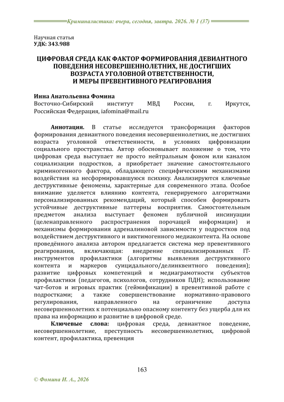 В статье исследуется трансформация факторов формирования девиантного поведения несовершеннолетних, не достигших возраста уголовной ответственности, в условиях цифровизации социального пространства. Автор обосновывает положение о том, что цифровая среда выступает не просто нейтральным фоном или каналом социализации подростков, а приобретает значение самостоятельного криминогенного фактора, обладающего специфическими механизмами воздействия на несформировавшуюся психику. Анализируются ключевые деструктивные феномены, характерные для современного этапа. Особое внимание уделяется влиянию контента, генерируемого алгоритмами персонализированных рекомендаций, который способен формировать устойчивые деструктивные паттерны восприятия. Самостоятельным предметом анализа выступает феномен публичной инсинуации (целенаправленного распространения порочащей информации) и механизмы формирования адреналиновой зависимости у подростков под воздействием деструктивного и виктимогенного медиаконтента. На основе проведённого анализа автором предлагается система мер превентивного реагирования, включающая: внедрение специализированных IT-инструментов профилактики (алгоритмы выявления деструктивного контента и маркеров суицидального/делинквентного поведения); развитие цифровых компетенций и медиаграмотности субъектов профилактики (педагогов, психологов, сотрудников ПДН); использование чат-ботов и игровых практик (геймификации) в превентивной работе с подростками; а также совершенствование нормативно-правового регулирования, направленного на ограничение доступа несовершеннолетних к потенциально опасному контенту без ущерба для их права на информацию и развитие в цифровой среде.