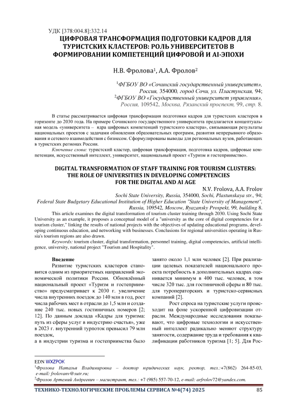 сии это означает необходимость переосмысления роли университетов: от функции поставщика выпускников к функции ядра формирования цифровых компетенций для региональных туристских кластеров. Цель статьи – проанализировать, как цифровая трансформация туризма и задачи национального проекта «Туризм и гостеприимство» меняют требования к подготовке кадров и какую роль в этом процессе играют университеты туристских регионов, на примере практики Сочинского государственного университета.