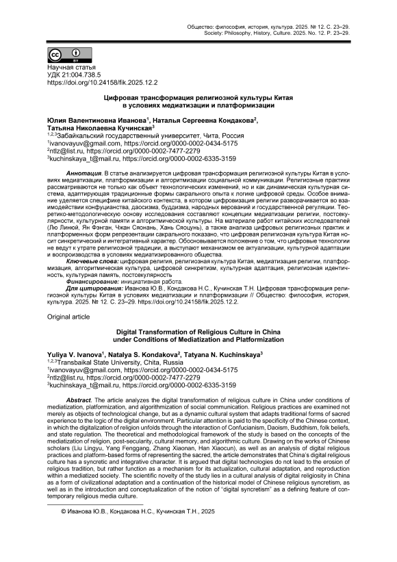 В статье анализируется цифровая трансформация религиозной культуры Китая в условиях медиатизации, платформизации и алгоритмизации социальной коммуникации. Религиозные практики рассматриваются не только как объект технологических изменений, но и как динамическая культурная система, адаптирующая традиционные формы сакрального опыта к логике цифровой среды. Особое внимание уделяется специфике китайского контекста, в котором цифровизация религии разворачивается во взаимодействии конфуцианства, даосизма, буддизма, народных верований и государственной регуляции. Теоретико-методологическую основу исследования составляют концепции медиатизации религии, постсекулярности, культурной памяти и алгоритмической культуры. На материале работ китайских исследователей (Лю Линюй, Ян Фэнган, Чжан Сяонань, Хань Сяоцунь), а также анализа цифровых религиозных практик и платформенных форм репрезентации сакрального показано, что цифровая религиозная культура Китая носит синкретический и интегративный характер. Обосновывается положение о том, что цифровые технологии не ведут к утрате религиозной традиции, а выступают механизмом ее актуализации, культурной адаптации и воспроизводства в условиях медиатизированного общества.