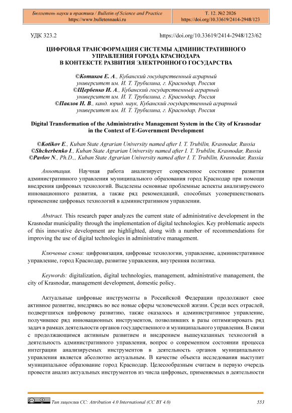 Цифровая трансформация системы административного управления города краснодара в контексте развития электронного государства