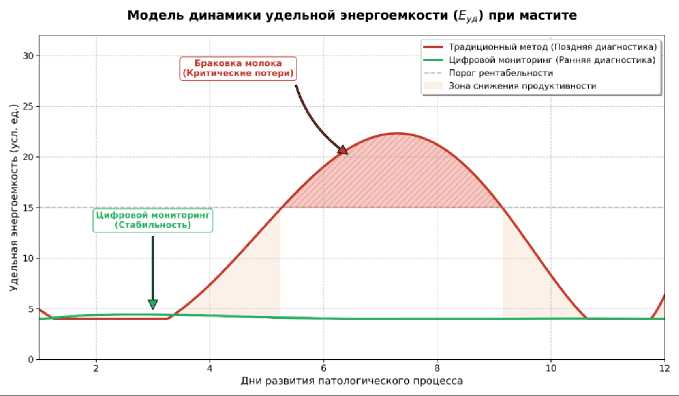1. Зона критических потерь (область со штриховкой): На графике выделена зона, где удельная энергоемкость традиционного метода (красная линия) превышает пороговое значение рентабельности ( E уд > 15). Эта зона соответствует периоду клинического течения болезни и лечения антибиотиками, когда молоко подлежит утилизации (браковке). В этот период все энергетические затраты фермы на содержание животного являются прямым убытком.