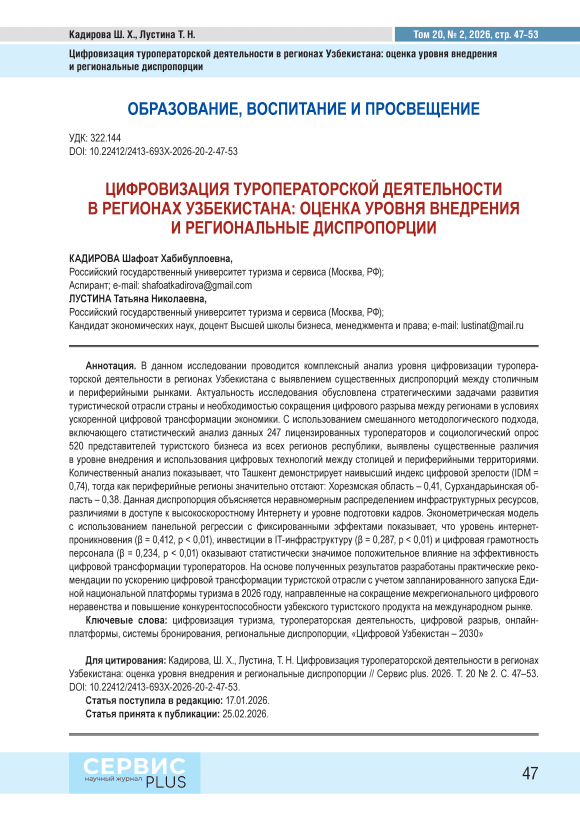 В данном исследовании проводится комплексный анализ уровня цифровизации туроператорской деятельности в регионах Узбекистана с выявлением существенных диспропорций между столичным и периферийными рынками. Актуальность исследования обусловлена стратегическими задачами развития туристической отрасли страны и необходимостью сокращения цифрового разрыва между регионами в условиях ускоренной цифровой трансформации экономики. С использованием смешанного методологического подхода, включающего статистический анализ данных 247 лицензированных туроператоров и социологический опрос 520 представителей туристского бизнеса из всех регионов республики, выявлены существенные различия в уровне внедрения и использования цифровых технологий между столицей и периферийными территориями. Количественный анализ показывает, что Ташкент демонстрирует наивысший индекс цифровой зрелости (IDM = 0,74), тогда как периферийные регионы значительно отстают: Хорезмская область – 0,41, Сурхандарьинская область – 0,38. Данная диспропорция объясняется неравномерным распределением инфраструктурных ресурсов, различиями в доступе к высокоскоростному Интернету и уровне подготовки кадров. Эконометрическая модель с использованием панельной регрессии с фиксированными эффектами показывает, что уровень интернет-проникновения (β = 0,412, p < 0,01), инвестиции в IT-инфраструктуру (β = 0,287, p < 0,01) и цифровая грамотность персонала (β = 0,234, p < 0,01) оказывают статистически значимое положительное влияние на эффективность цифровой трансформации туроператоров. На основе полученных результатов разработаны практические рекомендации по ускорению цифровой трансформации туристской отрасли с учетом запланированного запуска Единой национальной платформы туризма в 2026 году, направленные на сокращение межрегионального цифрового неравенства и повышение конкурентоспособности узбекского туристского продукта на международном рынке.