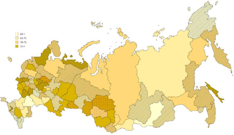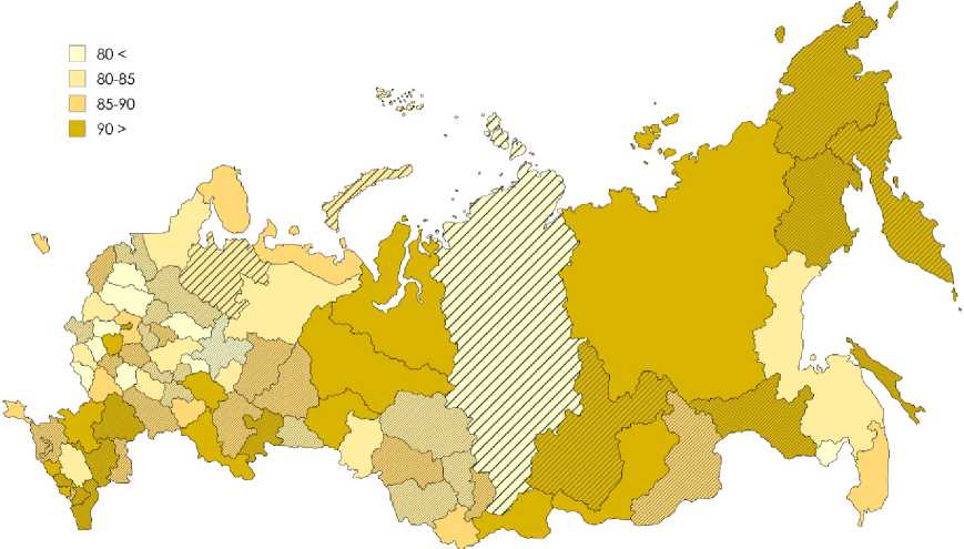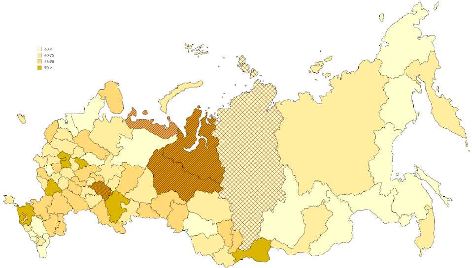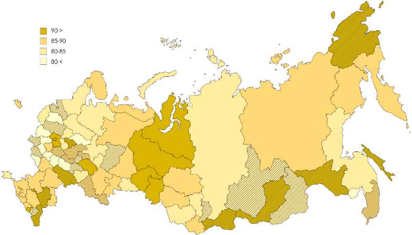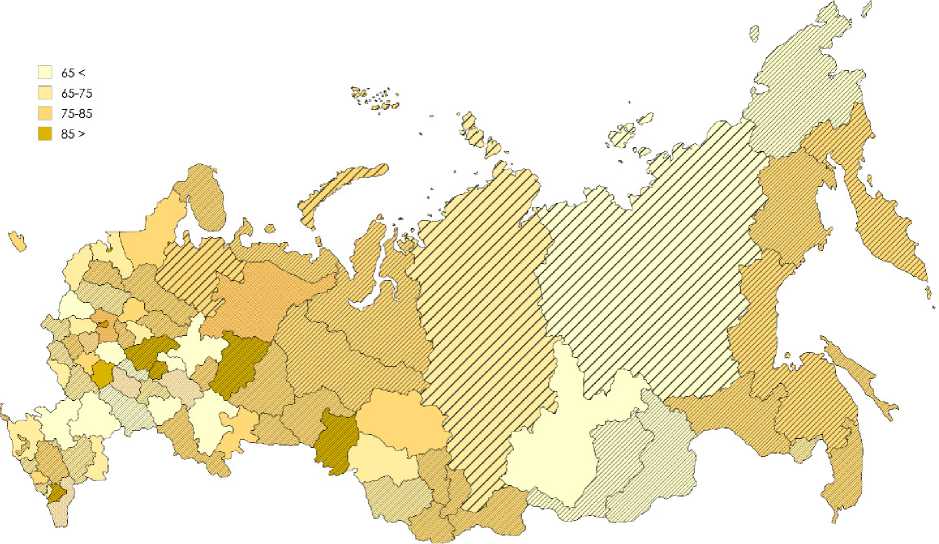 Рис. 3. Уровень ежедневного использования интернета среди населения в регионах России, 2023 год, % Примечание: заштрихованы регионы с темпом прироста в 2017–2023 гг. выше среднего.