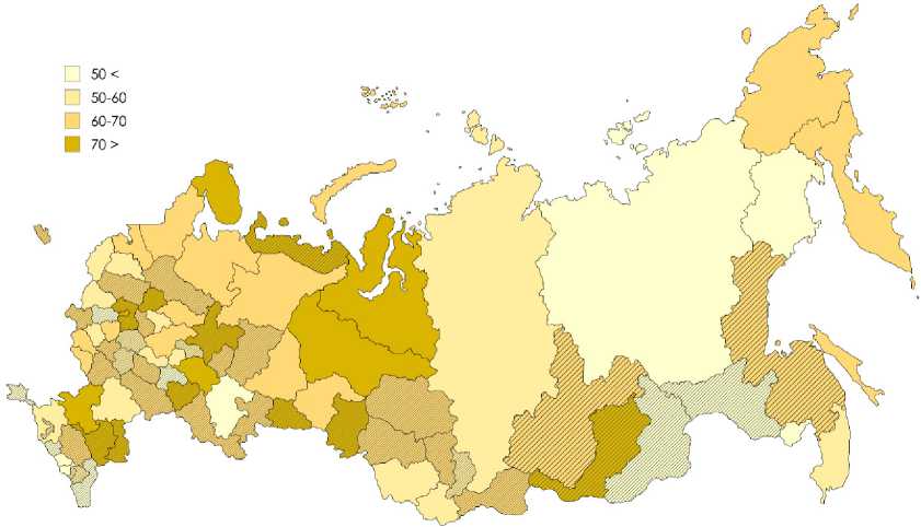 Рис. 4. Распространенность онлайн-покупок среди населения в регионах России, 2023 год, % Примечание: заштрихованы регионы с темпом прироста в 2017–2023 гг. выше среднего.