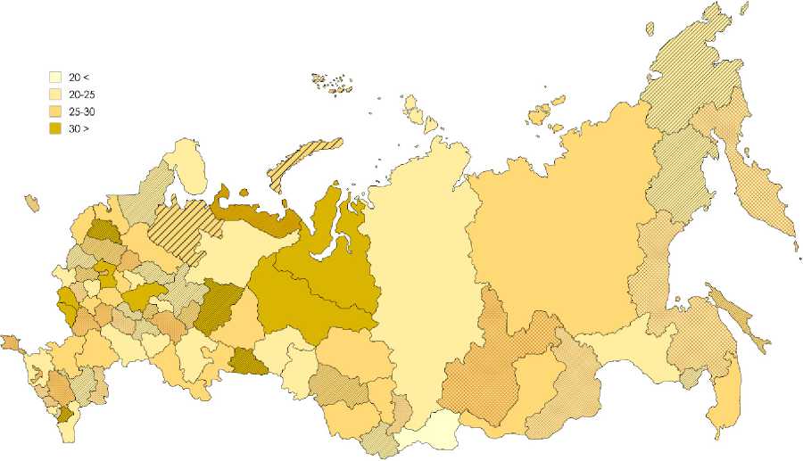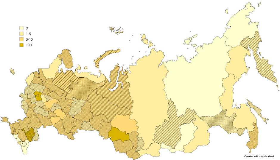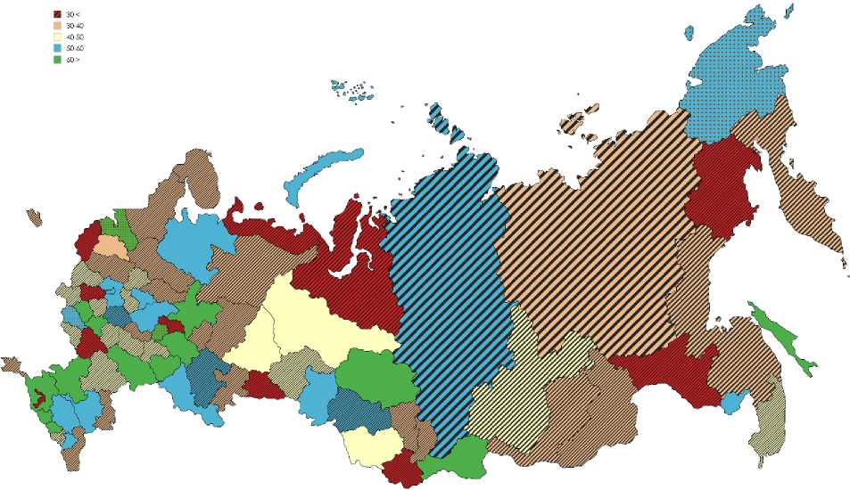 Рис. 9. Вовлеченность населения во взаимодействие с органами власти в регионах России, 2023 год, % Примечание: заштрихованы регионы с темпом прироста в 2017–2023 гг. выше среднего, сеткой – с отрицательным ростом.