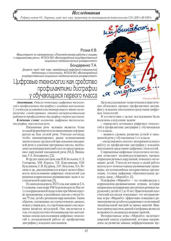 Цель исследования: теоретически и практически обосновать процесс профилактики дисгра-фии у младших школьников средствами цифровых технологий.