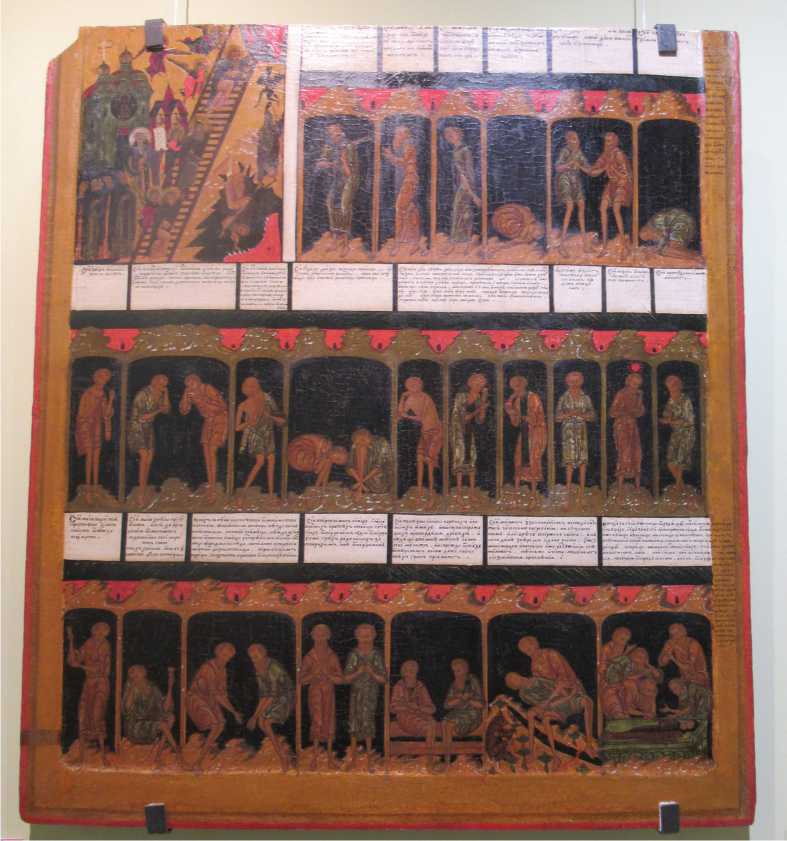 ἐναργοῦς, ἐν ῇ καὶ βίος τῶν καταδίκων, καὶ περὶ τῆς φυλακῆς). Канон иллюстрирован 32 миниатюрами, каждое изображение сопровождено комментирующей надписью; публикацию надписей см. в работе [3]. Филологическое исследование Покаянного канона содержится в монографии [4]: проанализированы 23 памятника русского изобразительного искусства, сохранивших сюжеты на тему Лествицы (4 книжные миниатюры, 9 икон, 3 фрески, 3 гравюры, 4 рисованных листов-«раскладушек» старообрядческой традиции), выявлены взаимоотношения этих произведений искусства в виде стеммы. В частности, рассмотрена икона «Ле-ствица преп. Иоанна Лествичника (с “пещерами”)» из собрания Карельского музея изобразительных искусств (№№ КМИИ КП-5559, И-1452, далее – КМИИ 1452); подробное описание этой иконы с аннотированной библиографией, а также публикация иконы представлены в иллюстрированном Каталоге «Лествица Иоанна Синайского в изобразительном искусстве» [5: 76–80 (кат. № 63), 239 (илл. 109)].