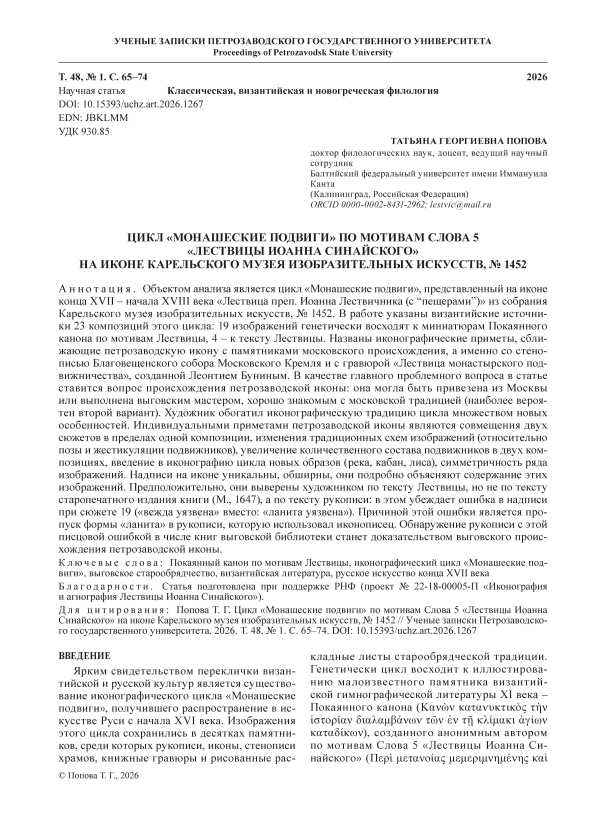 Объектом анализа является цикл «Монашеские подвиги», представленный на иконе конца XVII – начала XVIII века «Лествица преп. Иоанна Лествичника (с “пещерами”)» из собрания Карельского музея изобразительных искусств, № 1452. В работе указаны византийские источники 23 композиций этого цикла: 19 изображений генетически восходят к миниатюрам Покаянного канона по мотивам Лествицы, 4 – к тексту Лествицы. Названы иконографические приметы, сближающие петрозаводскую икону с памятниками московского происхождения, а именно со стенописью Благовещенского собора Московского Кремля и с гравюрой «Лествица монастырского подвижничества», созданной Леонтием Буниным. В качестве главного проблемного вопроса в статье ставится вопрос происхождения петрозаводской иконы: она могла быть привезена из Москвы или выполнена выговским мастером, хорошо знакомым с московской традицией (наиболее вероятен второй вариант). Художник обогатил иконографическую традицию цикла множеством новых особенностей. Индивидуальными приметами петрозаводской иконы являются совмещения двух сюжетов в пределах одной композиции, изменения традиционных схем изображений (относительно позы и жестикуляции подвижников), увеличение количественного состава подвижников в двух композициях, введение в иконографию цикла новых образов (река, кабан, лиса), симметричность ряда изображений. Надписи на иконе уникальны, обширны, они подробно объясняют содержание этих изображений. Предположительно, они выверены художником по тексту Лествицы, но не по тексту старопечатного издания книги (М., 1647), а по тексту рукописи: в этом убеждает ошибка в надписи при сюжете 19 («вежда уязвена» вместо: «ланита уязвена»). Причиной этой ошибки является пропуск формы «ланита» в рукописи, которую использовал иконописец. Обнаружение рукописи с этой писцовой ошибкой в числе книг выговской библиотеки станет доказательством выговского происхождения петрозаводской иконы.