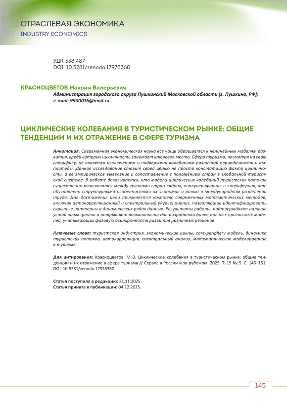 Современная экономическая наука все чаще обращается к нелинейным моделям развития, среди которых цикличность занимает ключевое место. Сфера туризма, несмотря на свою специфику, не является исключением и подвержена колебаниям различной периодичности и амплитуды. Данное исследование ставит своей целью не просто констатацию факта цикличности, а ее эмпирическое выявление и сопоставление с положением стран в глобальной туристской системе. В работе доказывается, что модели циклических колебаний туристских потоков существенно различаются между группами стран «ядра», «полупериферии» и «периферии», что обусловлено структурными особенностями их экономик и ролью в международном разделении труда. Для достижения цели применяется комплекс современных математических методов, включая автокорреляционный и спектральный (Фурье) анализ, позволяющие идентифицировать скрытые паттерны в динамических рядах данных. Результаты работы подтверждают наличие устойчивых циклов и открывают возможности для разработки более точных прогнозных моделей, учитывающих фазовую асинхронность развития различных регионов.
