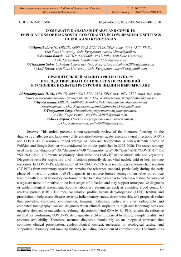 Текст научной статьи Comparative Analysis of ARVI and COVID-19: Implications of Diagnostic Constraints in Low-Resource Settings of India and Kyrgyzstan