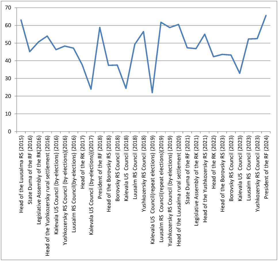 It is also worth mentioning that the electoral process is quite diverse. This is especially true considering that the number of cases of electoral activity among voters in the Kalevalskiy District analyzed for the period from 2015 to 2024 includes election campaigns at the local, federal and regional levels, which are divided into “first” and “second” order elections.