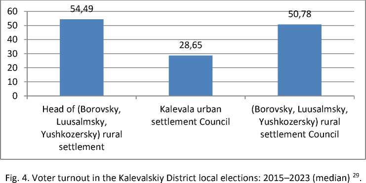 According to the theory of “second-order” elections by K. Reif and H. Schmitt [13], local elections are of secondary importance. “Voter turnout in local government elections is usually the lowest compared to presidential and parliamentary elections” [14, Turovskiy R.F., Korneeva E.M., Vase-lenko O.S., p. 121]. However, the participation of residents of the Kalevalskiy District in local elections only partially confirms this statement, as an analysis of data for the period 2015–2023 showed that voter turnout in the Borovskiy, Luusalmskiy, and Yushkozerskiy rural settlement council elections was distributed within the average range, with declines only in the Kalevala Urban Settlement Council elections 28 (see Figures 1 and 4) amid weak political competition (see Table 7).