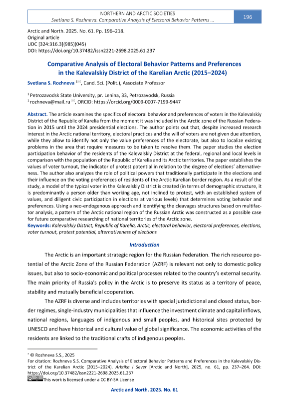 The article examines the specifics of electoral behavior and preferences of voters in the Kalevalskiy District of the Republic of Karelia from the moment it was included in the Arctic zone of the Russian Federation in 2015 until the 2024 presidential elections. The author points out that, despite increased research interest in the Arctic national territory, electoral practices and the will of voters are not given due attention, while they allow to identify not only the value preferences of the electorate, but also to localize existing problems in the area that require measures to be taken to resolve them. The paper studies the election participation behavior of the residents of the Kalevalskiy District at the federal, regional and local levels in comparison with the population of the Republic of Karelia and its Arctic territories. The paper establishes the values of voter turnout, the indicator of protest potential in relation to the degree of elections’ alternativeness. The author also analyzes the role of political powers that traditionally participate in the elections and their influence on the voting preferences of residents of the Arctic Karelian border region. As a result of the study, a model of the typical voter in the Kalevalskiy District is created (in terms of demographic structure, it is predominantly a person older than working age, not inclined to protest, with an established system of values, and diligent civic participation in elections at various levels) that determines voting behavior and preferences. Using a neo-endogenous approach and identifying the cleavages structures based on multifactor analysis, a pattern of the Arctic national region of the Russian Arctic was constructed as a possible case for future comparative researching of national territories of the Arctic zone.