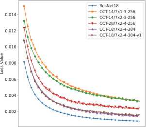 The training loss for different models is shown in fig. 1 with the first few epochs omitted from the plot due to high initial values. From the figure, we observe that each network converges to different final loss values. For example, ResNet18 achieves the lowest loss value, while CCT-14/7 x 1-3-256 and CCT-14/7 x 2-3-256 exhibit the highest. However, further analysis reveals that differences in loss values do not directly correlate with final result quality.