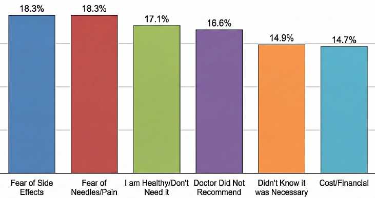 3. Vaccination Barriers are Emotional and Structural With a vaccination rate of 51.6%, the unvaccinated population cited specific, actionable barriers. Fear: Combined, 36.6% of non-vaccinated individuals cited fear as their primary reason (18.3% fear of side effects + 18.3% fear of needles/pain). Systemic Failure: 16.6% of people did not get vaccinated simply because "The doctor did not recommend it," highlighting a missed opportunity for healthcare providers to intervene.