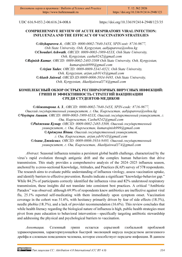 Seasonal influenza remains a persistent global health challenge, characterized by the virus’s rapid evolution through antigenic drift and the complex human behaviors that drive transmission. This study provides a comprehensive analysis of the 2024–2025 influenza season, anchored by a cross-sectional Knowledge, Attitudes, and Practices (KAP) survey of 578 respondents. The research aims to evaluate public understanding of influenza virology, assess vaccination uptake, and identify barriers to effective prevention. Results indicate a significant “knowledge-behavior gap.” While 84.2% of participants correctly identified the influenza virus and 82% understood respiratory transmission, these insights did not translate into consistent best practices. A critical “Antibiotic Paradox” was observed: although 69.9% of respondents knew antibiotics are ineffective against viral flu, 25.1% reported self-medicating with them immediately upon symptom onset. Vaccination coverage in the cohort was 51.6%, with hesitancy primarily driven by fear of side effects (18.3%), needle phobia (18.3%), and a lack of provider recommendation (16.6%). This review concludes that while health literacy regarding the biological nature of influenza is high, public health strategies must pivot from pure education to behavioral intervention—specifically targeting antibiotic stewardship and addressing the physical and psychological barriers to vaccination.
