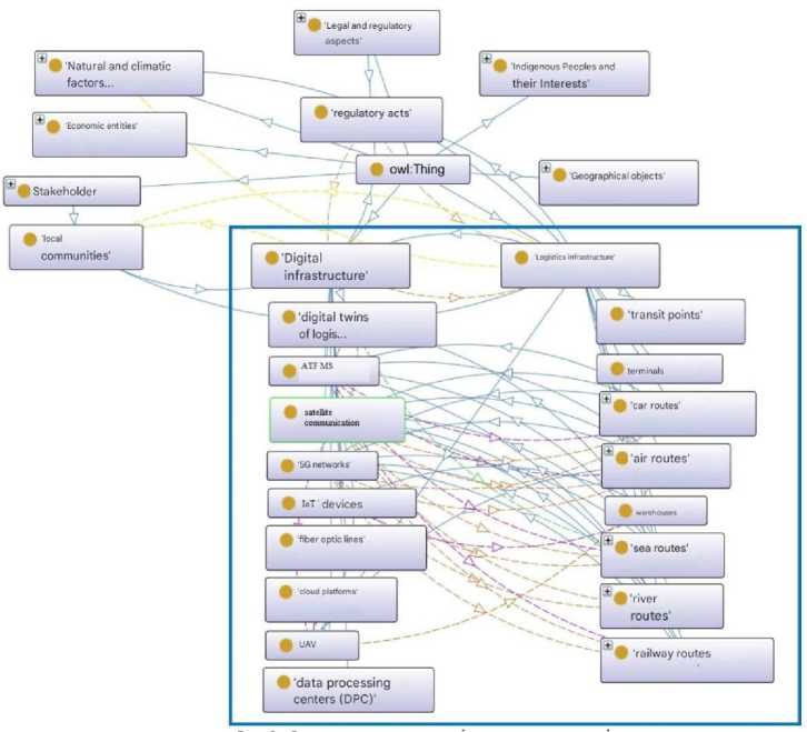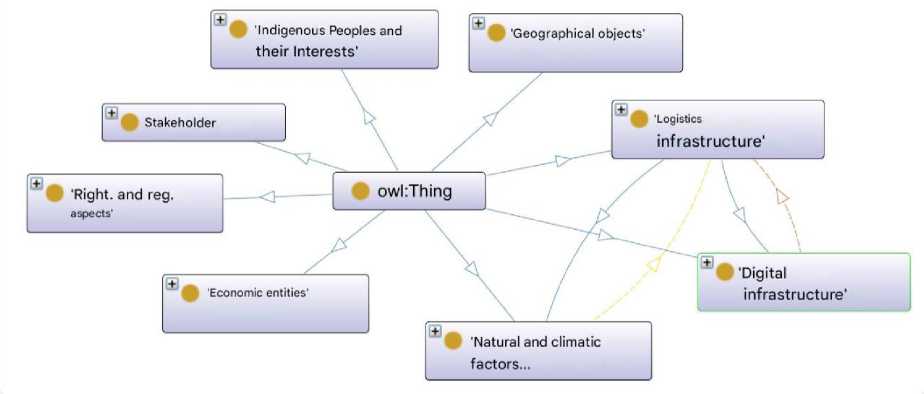 Ontologies are a powerful tool for structuring and organizing knowledge areas. They provide a formal representation of concepts and their interrelations, facilitating information exchange, knowledge integration, and informed decision-making. In the context of the Arctic oil and gas industry, ontology serves as a critical roadmap guiding sustainable development [9]. The creation of ontology for the Russian Arctic zone will provide a clear understanding of the multifaceted aspects of Arctic logistics and digital infrastructure, which, in turn, will be the first step towards effective analysis of data on the state of the region. Establishing relationships between the key entities of the system(s) under consideration creates the preconditions for a more in-depth analysis and identification of opportunities for implementing new types of connections. Ontology will also create a common language for information exchange between various industry stakeholders — governments, researchers, and indigenous communities, enabling effective interaction and collaborative decision-making.