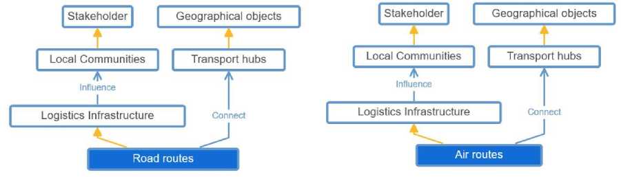 Fig. 11. Relationships between entities of the ontology’s logistics infrastructure: road routes, air routes (compiled by the authors).