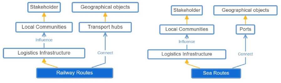 Fig. 12. Relationships between entities of the ontology’s logistics infrastructure: rail routes, sea routes (compiled by the authors).