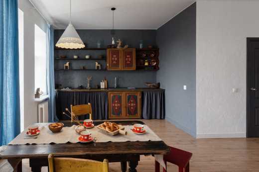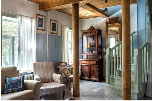 При этом отсутствуют гарнитуры мебели – даже стулья у обеденного стола намеренно подбирают разного дизайна. В подборе разностильных предметов мебели важно соблюсти баланс – современные предметы мебели должны быть нейтральными, своеобразным фоном для уникальных предметов, которые становятся доминантами интерьера, как старинный буфет в интерьере «Синего дома» в Суздале (рис. 2).