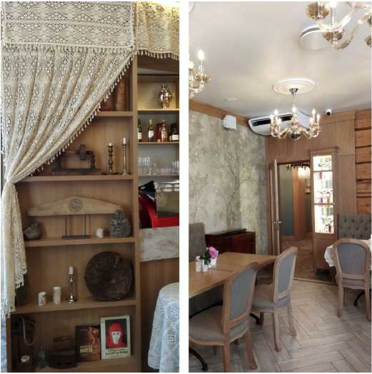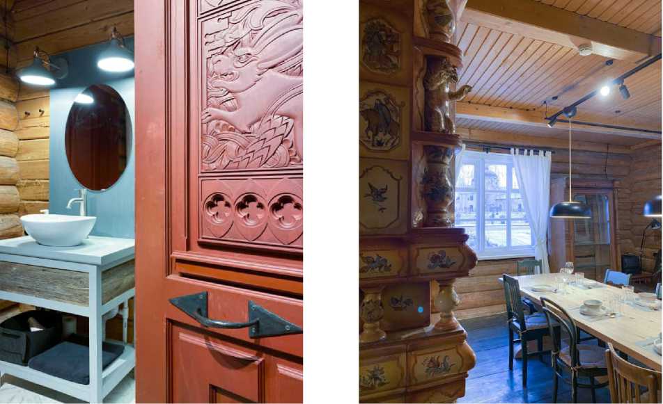 Fig. 7. The restaurant interior fragment in the boutique hotel “Marusya” in Vologda and the interior of the guesthouse “Carriage Shed” in Kirillov