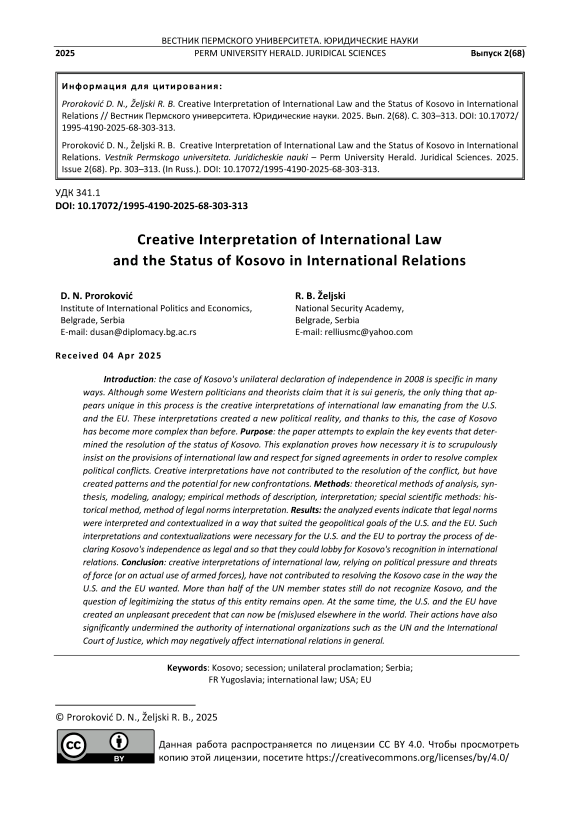 Введение: ситуация одностороннего провозглашения независимости Косово в 2008 году является специфической во многих отношениях. Хотя некоторые западные политики и теоретики утверждают, что это уникальный процесс, единственное, что представляется в нем уникальным, – это избирательная интерпретация международного права со стороны США и ЕС. Такая интерпретация создала новую политическую реальность, вследствие чего ситуация в Косово стала еще более сложной, чем ранее. Цель: в статье предпринята попытка объяснить ключевые события, которые определили решение вопроса о статусе Косово. Данное объяснение доказывает, насколько важно неукоснительно придерживаться положений международного права и соблюдать подписанные соглашения для разрешения сложных политических конфликтов. Избирательные интерпретации не способствовали разрешению конфликта, но создали модель и потенциал для новых конфронтаций. Методы: теоретические методы анализа, синтеза, моделирования, аналогии; эмпирические методы описания, интерпретации; специальные научные методы: исторический метод, метод толкования правовых норм. Результаты: проанализированные события свидетельствуют о том, что правовые нормы интерпретировались и контекстуализировались таким образом, чтобы соответствовать геополитическим целям США и ЕС. Это было им необходимо для того, чтобы представить процесс провозглашения независимости Косово как легитимный и иметь возможность лоббировать признание Косово в международных отношениях. Вывод: избирательное толкование международного права, основанное на политическом давлении и угрозах применения силы (либо на фактическом применении силы), не способствовало разрешению ситуации в Косово так, как того хотели США и ЕС. Более половины государств – членов ООН по-прежнему не признают Косово, и вопрос о легитимизации статуса этого образования остается открытым. В то же время США и ЕС создали негативный прецедент, который теперь может быть использован в других странах. Их действия также существенно подорвали авторитет таких международных организаций, как ООН и Международный Суд ООН, что может иметь негативное влияние на международные отношения в целом.