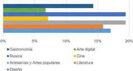 As for the Creative Cities Network, it has its own categorization where cities, when applying to this network, must choose one of the approaches based on the cultural elements that most coincide with the network. In this way, 19% of the cities are related to the category of crafts and folk arts, 19% of the creative cities are in the musical field, another 17% in terms of design, 16% of these cities in literature, 14% of the creative cities in gastronomy, 7% in cinema, and another 7% in digital art (Fig. 5).