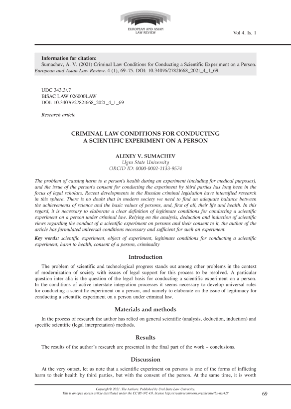 The problem of causing harm to a person’s health during an experiment (including for medical purposes) has long been in the focus of legal scholars (Greenberg, 1963; Greenberg, 1992; Krasikov, 1976; Kurlandsky & Khan-Magomedov, 1972; Malein, 1975; Sivokon’, 1968). Recent introduction of Article 41 ‘Reasonable Risk’ in the current Criminal Code of the Russian Federation1 (hereinafter referred to as the RF CC) has intensified research in this sphere.